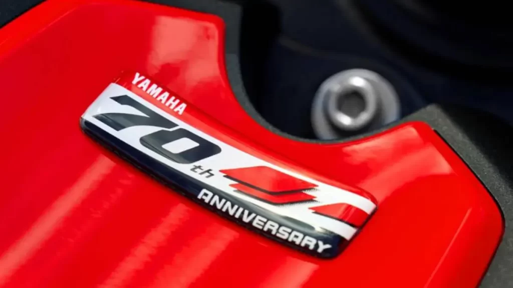 Cada moto traz o clássico esquema de cores branco com detalhes vermelhos — conhecido entre os fãs como “Speed Block” — acompanhado do emblema comemorativo de 70 anos no tanque e logotipos dourados da Yamaha, que representam a longevidade das “forquilhas de afinação” da marca nas pistas.